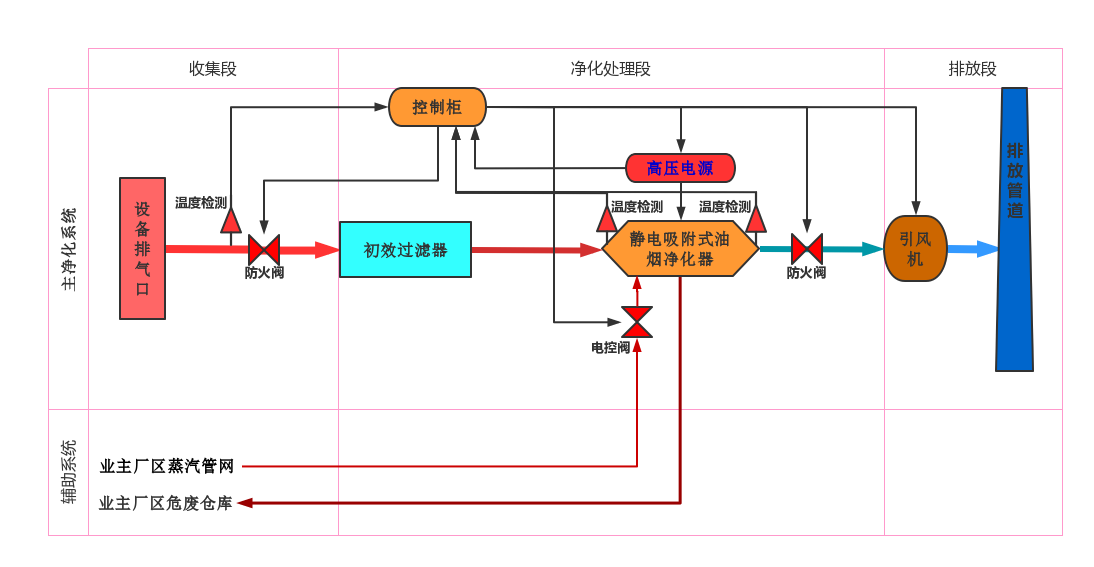 化纖車間作業(yè)廢氣,由設備排氣口接入廢氣收集管道,順不銹鋼管道進入初效過濾器,先經(jīng)不銹鋼絲網(wǎng)初效過濾器濾除廢氣中的灰塵、纖維類顆粒物后,通過管道接入靜電吸附式油煙凈化器,經(jīng)凈化器內(nèi)高壓電場作用,油煙中油霧顆粒被電場陽極捕捉,順陽極滴落在集油盤中,由排油口排出至廢油收集桶。經(jīng)油煙凈化器凈化后的氣體,經(jīng)引風機送入排放煙囪對空15米達標排放。