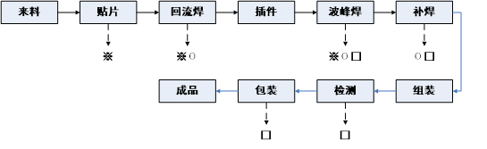 本項目主要產(chǎn)品為移動手機、振動馬達,生產(chǎn)工藝基本一致。①在PCB板上需貼片的位置刷錫膏;②通過貼片機在對應位置上貼芯片;③通過回流焊進行焊接,使芯片固定在PCB板上;④通過插件機進行插件;⑤通過波峰焊進行焊接,使插件固定在PCB板上,⑥使用電烙鐵將PCB板與各電子配件進行線路連接,⑨手工組裝外殼;⑩最后經(jīng)老化測試合格后,即為成品。